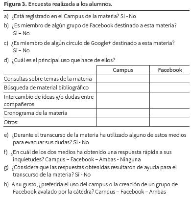 El grupo de estudio correspondió a tres comisiones que contaron con cantidades equivalentes de alumnos, cada una de las cuales se encontró a cargo de un docente de la materia. En dicha encuesta (figura 3) se indagó sobre la utilización y la aplicación de plataformas virtuales relacionadas con la materia (Campus virutal, Facebook y Google+).