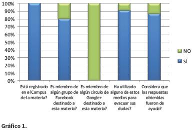 En el gráfico 1 se observa que el 100% de los alumnos que se encontraban cursando la materia estaban registrados en el Campus de Química Orgánica II. Por otra parte, el 80% afirmó pertenecer a un grupo privado de Facebook relacionado con la materia. Un 90% de los cursantes utilizó alguna de estas herramientas tecnológicas como medio de consulta de sus dudas, mientras que el 87% consideró que las respuestas obtenidas fueron de gran utilidad para la aprobación de la materia.