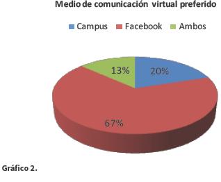 El gráfico 2 revela que un 67% de los alumnos encuestados preferiría como medio de comunicación Facebook mientras que solo un 13% el Campus Virtual avalado por la cátedra.