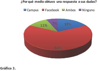 Por otra parte, el 64% de los estudiantes consideró que Facebook fue el medio por el cual obtuvieron una rápida respuesta a sus dudas e inquietudes, frente al 11% y al 7% que consideró al Campus Virtual o a ambos medios, respectivamente (gráfico 3).