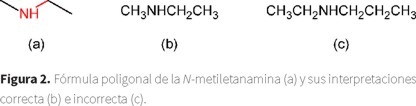 Por otra parte, la razón de dibujar las fórmulas poligonales de manera zigzagueante es que de esa forma se hacen notar los distintos segmentos que constituyen la línea poligonal; es decir, que indican los carbonos que forman el compuesto. Esa herramienta pedagógica en cierta manera hace correspondencia con la conformación más estable de algunos compuestos pero se contrapone con la geometría de otros. Tal es el caso de la estereoisomería E/Z de los alquenos (ya que el (2Z)-but-2-eno no se puede ilustrar mediante una línea zigzagueante (figura 5b), ni tampoco deberían mostrarse en zig-zag los enlaces CCC y NCC de las moléculas 5c-d, pues la geometría de esas zonas es lineal y no angulada como la presentan los autores en la p. 179 (figura 5e-f).