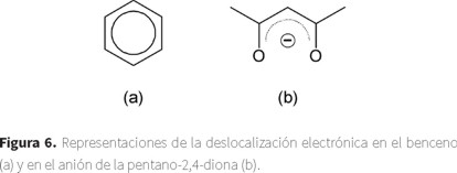 Por si eso fuera poco, a las fórmulas poligonales también se les agregan otros elementos más, como un círculo en el benceno (figura 6a) o una línea punteada semicircular que representa la deslocalización electrónica en el anión de la pentano-2,4-diona (figura 6b).