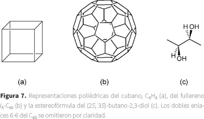 Si sumamos además los compuestos poliédricos como el cubano (C8H8),1 el fullereno Ih-C60 y las líneas que se usan en las estereofórmulas, entonces la definición de "fórmulas estructurales a base de líneas (poligonales)" se queda corta, pues hay radicales que se encuentran fuera del plano (cuña), dentro del plano (líneas paralelas) o en el plano (línea plana) (figura 7c). Ante todo este universo de elementos geométricos que detallan en mayor o menor grado la estructura de un compuesto, creemos que el término: "Fórmulas moleculares geométricas" sería más descriptivo de los elementos que las constituyen, agregando que serían "híbridas" si contienen caracteres alfanuméricos (como símbolos químicos, números a manera de subíndices, etc. (figura 3a)) y "puras" si sólo están constituidas por elementos geométricos (figuras 5c-d y 7a-b).