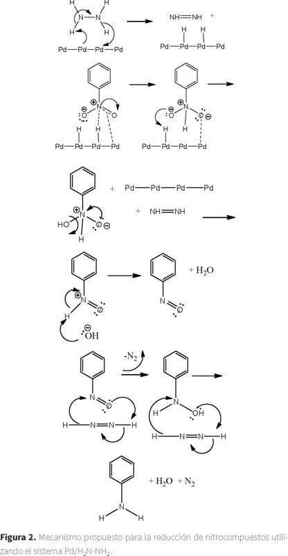 Además de lo anterior, es muy importante la quimioselección derivada de la sustitución presente en el sistema aromático. Es destacable observar cómo, para los sustratos con sustituyentes activadores, los rendimientos son mucho mayores que para aquellos que presentan grupos desactivadores. Esto muy probablemente esté relacionado con el mecanismo propuesto (House, 1972) (figura 2) para la reducción de grupos nitro en presencia del sistema Pd/H2N-NH2.