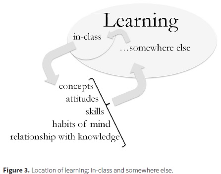 We support collaborative learning in its many expressions. However, we also acknowledge that our students do most of their learning outside the formal environments of our classrooms and laboratories somewhere else and away from our direct influence, Figure 3. Preliminary results of study habits at our institution showed that 87% of students enrolled in General Chemistry 1 in the Fall of 2012 did most of their unsupervised learning individually. In reporting the percentage of time that they studied with others outside the classroom, 48% reported "no considerable amount of time," 21% "up to one quarter of the time," and 18% "up to one half of the time." Although the National Survey of Student Engagement, NSSE, does not directly address study habits outside the classroom, its 2012 Report shows that more than half of the Physical Sciences majors who responded the survey, never or only sometimes "worked with classmates outside of class to prepare class assignments" (National Survey Student Engagement, 2013).