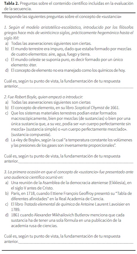 Para el desarrollo de la SEA hemos seleccionado los dos más importantes conceptos del curso de Química General Universitaria: «sustancia» y «reacción química». La razón se basa en las múltiples concepciones alternativas que nuestros estudiantes traen al curso sobre este par de conceptos clave para la enseñanza de la química (Andersson, 1990; Johnson, 1996; 2000), así como la problemática de su aprendizaje (Azcona et al., 2004; Furió-Mas y Domínguez-Sales, 2007), cuestiones que han sido consideradas para el diseño. Un trabajo sobre una secuencia del concepto de sustancia acaba de aparecer en la literatura (Furió-Mas, Domínguez-Sales y Guisasola, 2012). Desde el punto de vista filosófico también se da la discusión sobre cuál de estos dos conceptos debe introducirse primero en la epistemología de la química (Schummer, 2004).