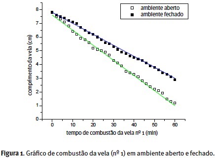 A Figura 1 mostra o gráfico da combustão da vela n° 1, na qual apresenta o tempo de consumo em ambiente aberto e fechado, e a regressão linear para ambos os ambientes. Pode-se observar uma variação na velocidade, pois em ambiente aberto há uma remoção facilitada dos produtos de reação (CO2 e H2O) da proximidade da vela repondo-se facilmente o oxigênio consumido.