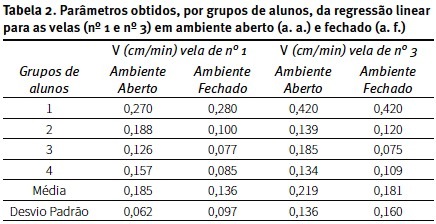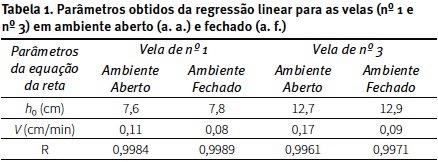 A Tabela 1 mostra os dados obtidos através do ajuste linear em ambiente aberto (a. a.) e fechado (a. f.). Lembrando que a regressão linear é representada pela equação da reta (y = a + b·x), sendo substituído no presente trabalho pelas variáveis (h = h0 + v·t), onde h é altura, h0 é a altura inicial, v é a velocidade média da reação e t é o tempo. No nosso caso, a velocidade do processo está sendo acompanhada pela taxa de decréscimo da vela com o tempo.