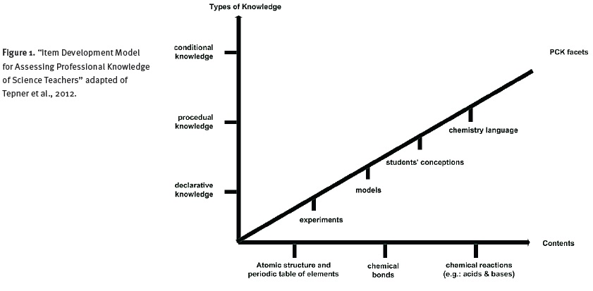 The subject specific professional knowledge test of Dollny (2011) measures content knowledge (e.g. about the periodic table of elements, acids and bases) and pedagogical content knowledge of chemistry teachers. The content knowledge items are designed in a multiple-choice single-select format. The pedagogical content knowledge items have a closed-item format with a Likert-scale, ranging from 1 (e.g. "very important", "very meaningful") to 6 (e.g. "unimportant", "meaningless") (Dollny, 2011;Witner and Tepner, 2011). The items were constructed using the "Item Development Model for Assessing Professional Knowledge of Science Teachers" (Tepner et al., 2012) (Fig. 1). The three axes of the model describe the knowledge areas, the PCK-facets and the content. The knowledge axis is divided into procedural, declarative, and conditional knowledge. Conditional knowledge composes the knowledge of when and why an activity or process is executed. Procedural knowledge is the knowledge about how behaviour and processes in class are created. Facts and terms form the declarative knowledge. Originally, the PCK-facets included the knowledge of experiments, students' conceptions, and models as central elements of PCK (Tepner at al., 2012; cf. Jüttner, Boone, Park, and Neuhaus, 2013; Tepner and Dollny, 2014; Van Driel, de Jong, and Verloop, 2002). Later on, teachers' handling of chemistry language was added to the facets.