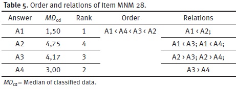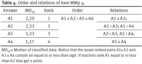 For creating a point of reference, the median of classified data for each answer of the model items was calculated with IBM® SPSS® Statistic. The median of classified data is used as the so-called aggregate expert of the model items. After this, the four answers of each item were ranked (see Tab. 4 and 5). The rank of an answer describes the position in the order that was done after the ranking. The order was the basis for creating quasi-ranked pairs (Thillmann, 2008, Walpuski et al., 2012) (Tab.4 and 5). For the fifteen model items fifteen orders and 84 quasi-ranked pairs (relations) were created (booklet A: 36 relations and one item is a true/false item; booklet B: 48 relations).