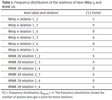 The frequency distribution of the scores was calculated (see an example in Tab. 7). A relation is not included in the calculations later, e.g. MNM 28 relation 2_3 (Tab. 7), if less than 5 experts score in a relation. At the end booklet A contains 32 relations and booklet B 43 relations.