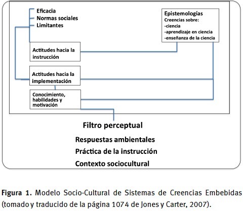 Aunque esta figura es plana, sus autoras indican que hay interacciones múltiples entre sus elementos. Es importante hacer notar que este modelo está acotado por el contexto socio-cultural del profesor (pares, estudiantes, cultura, etc.). Las autoras no identifican un punto real de origen, pero empiezan por describir tres características fundamentales "Conocimiento, habilidades y motivación", las cuales son requisitos para engranarse en una práctica de instrucción. Esta casilla se ve afectada por dos conjuntos de actitudes, el de la propia instrucción y el de la implementación de la misma. Puede verse también, en el modelo, que las actitudes del profesor de ciencias están fuertemente influidas por las creencias epistemológicas (que pueden ser de los tres tipos descritos en el diagrama: sobre la ciencia, sobre el aprendizaje de la ciencia y sobre su enseñanza). Así pues, desde un punto de vista epistemológico, el conocimiento es construido socialmente, aunque las creencias lo son individualmente. Nos dice Schraw (2013, p. 1) que la "Epistemología es el estudio de las creencias acerca del origen y adquisición del conocimiento".