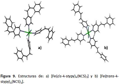 En la figura 9 se observan las estructuras de los compuestos que componen al sistema [Fe(4-stypy)4(NCS)2]. Se propone que una de las especies estudiadas presente un SCO dependiente de la temperatura, mientras que la otra presente en cualquier rango de temperatura una configuración alto espín. Otros sistemas cis-trans estudiados por el grupo de Boillot son [Fe(trans-hsbpy)2](NCS)2 siendo trans-hsbpy = 4-heptadecil-4'-trans-estiril-2,2'-bipiridina y [Fe(4-stypy)4(NCBPh3)2] (Boillot, et al., 1999).