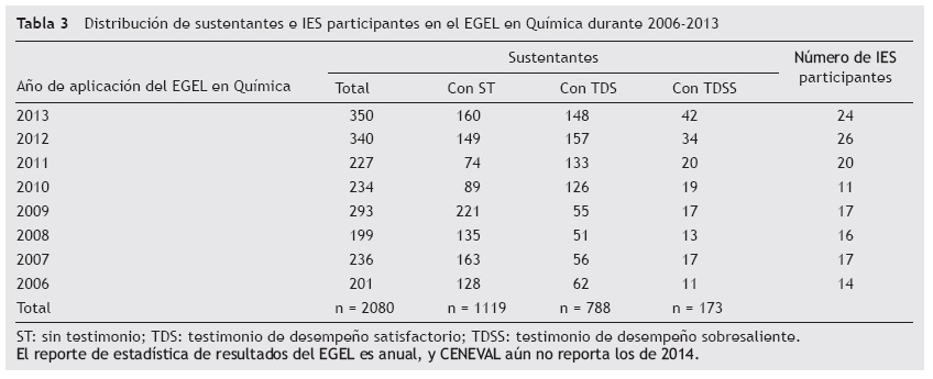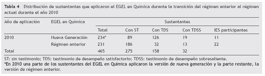 Los datos de la tabla 4 se dividen en dos poblaciones de sustentantes durante 2010, ya que ese año ocurrió la transición del EGEL en Química del régimen anterior al esquema de nueva generación. En el caso del EGEL-QUIM, la nueva versión comenzó a aplicarse de manera regular a partir de marzo de 2011 (la aplicación piloto-operativa fue en diciembre de 2010).