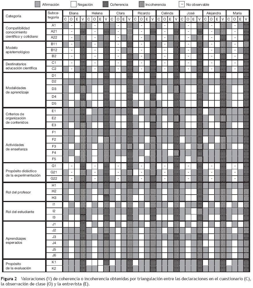 Los datos recopilados por las tres instancias de recogida se presentan en una tabla de acuerdo con las siguientes claves: una marca gris (afirmación) si el profesor comparte total o parcialmente la subcategoría/representación afirmada en el cuestionario, la sostiene en la entrevista o se observa efectivamente en sus acciones en el aula, y una marca blanca (negación) en caso contrario.