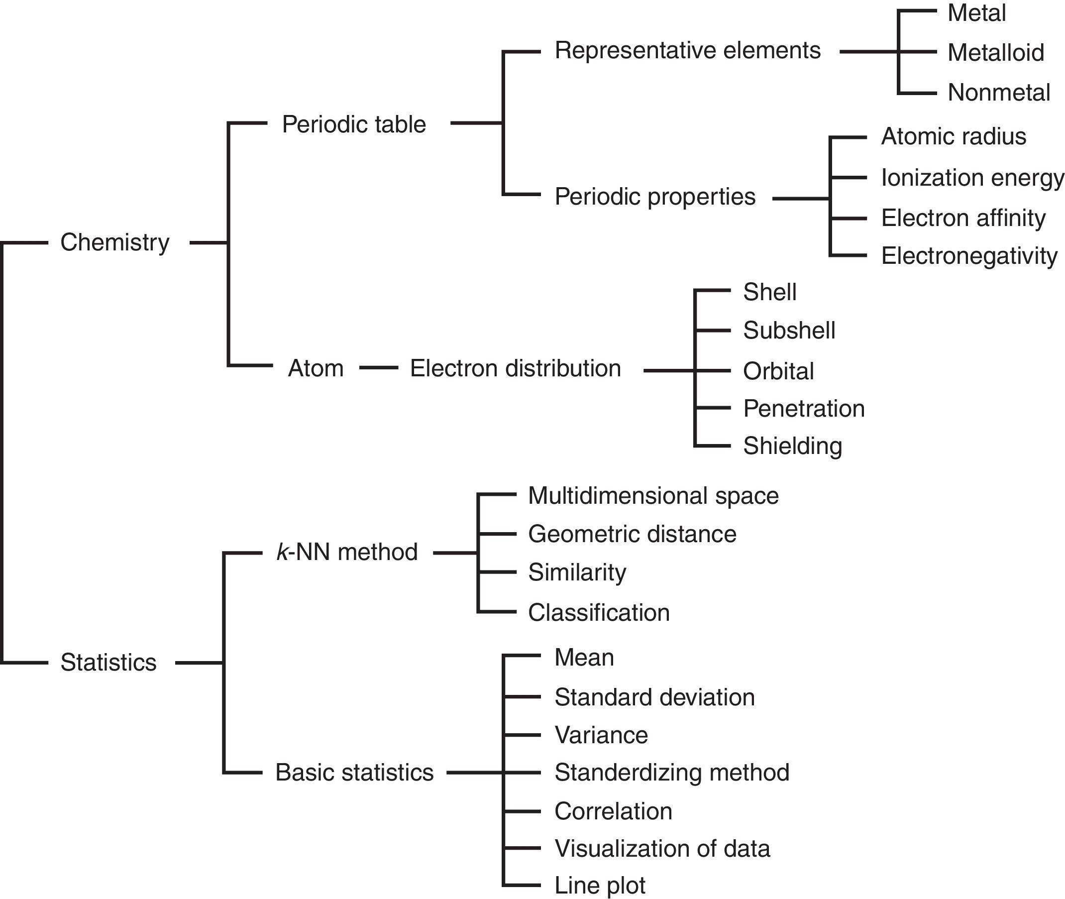 The main pedagogical objective of this paper is to show how statistical method such as k -NN can be used in data analysis in Chemistry, particularly in making comparisons, as it is described in this example with the representative elements. So this work is a guide to the use of k -NN classification technique intended to teachers and advanced college students. Authors believe that chemometrics, the use of statistics in chemistry, is important to anyone who deals with chemical information. Chemometric methods enjoy an ever-increasing popularity and there is a need to introduce more graduate students to these research tools (Öberg, 2006). The topics involved that emerges from Chemistry and Statistics can be visualized in Fig. 1.