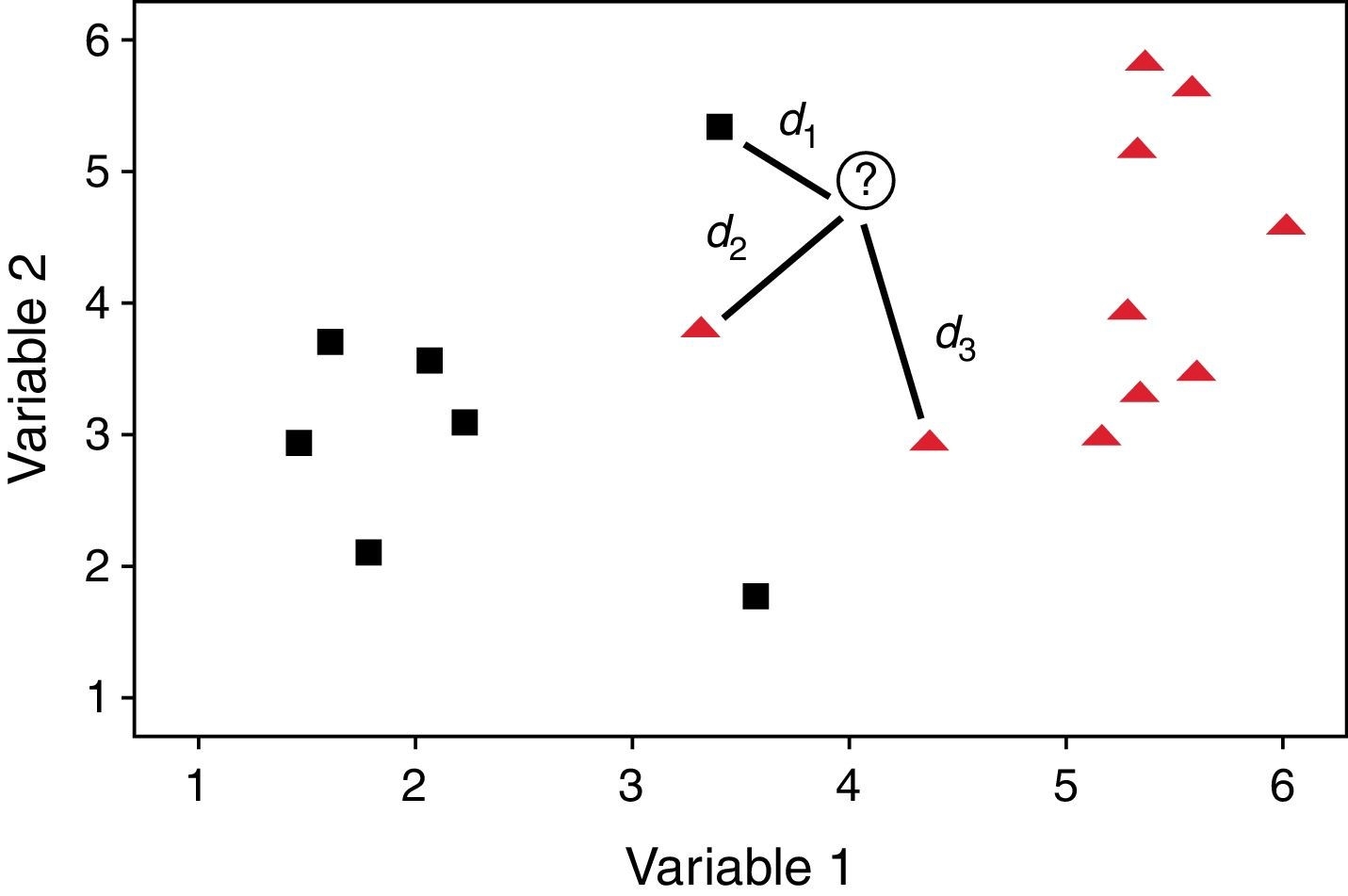 Whenever you have to find patterns by analyzing a huge data matrix, it is certainly difficult to make comparisons by visualizing the raw data. So application of a pattern recognition method is desirable. A very simple approach that can be easily performed and understood is the k nearest neighbor (k -NN) method. The algorithm in this method classifies an object into a distinct class when there are two or more groups of objects of known class. It is based on the concept of proximity and makes no assumption about the distribution in the classes (Miller & Miller, 2005). This similarity technique assumes that the closer objects lie in measurement space, the more likely they belong to the same category or they are similar with respect to the variables under study. In general, when the number of measurements is two or three, the classification of objects can be done by simple graphical approaches in two or three dimensions, respectively. But in the cases where there are more than three variables, as is usual in chemistry, it is necessary to extend the concept of distance to one in multidimensional space, each axis representing a variable. Although we cannot visualize more than three dimensions, computers can handle geometry in an indefinite number of dimensions, and the idea of distance is easy to generalize (Brereton, 2007).