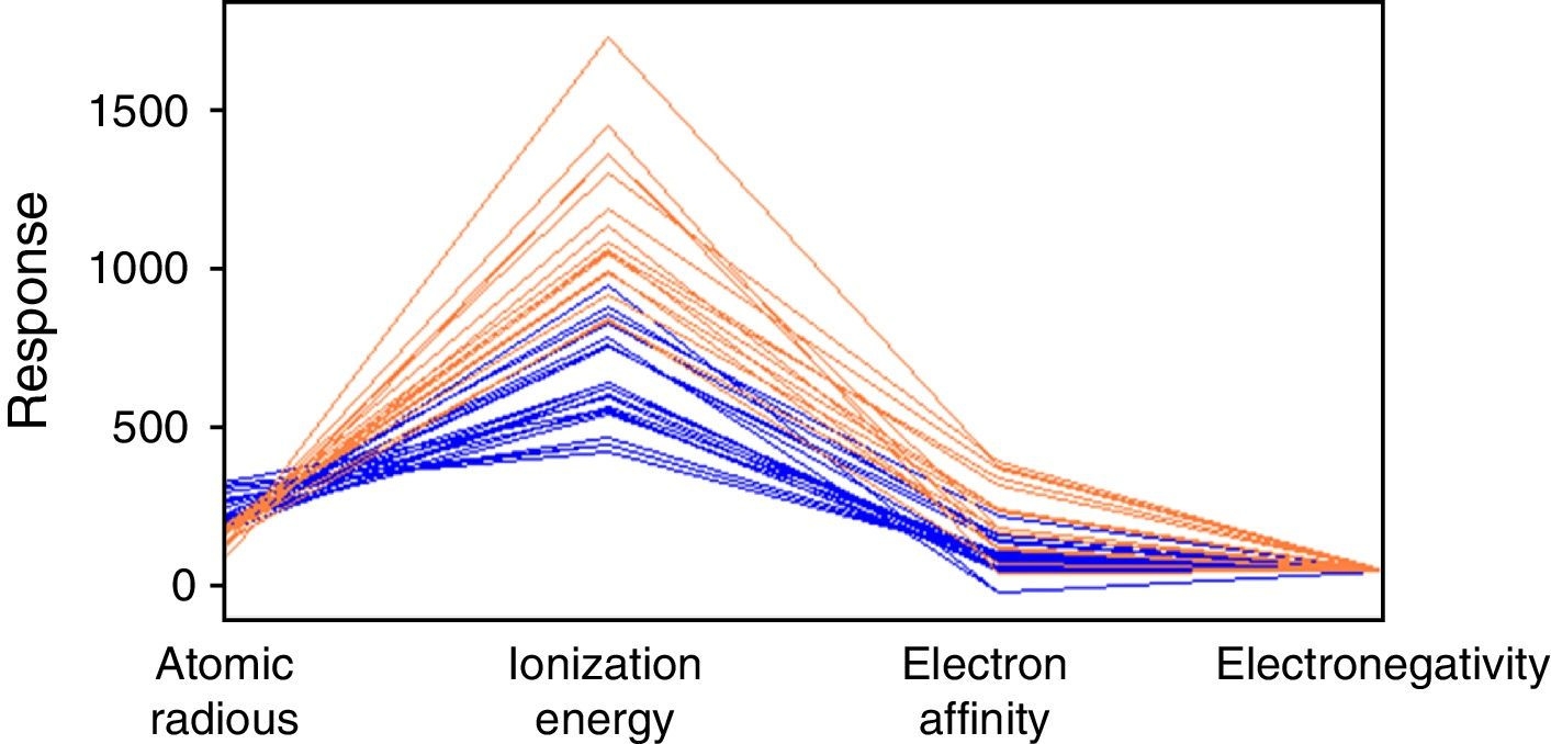 Fig. 3 is a line plot of the data in Table 1, which exhibits response values for the periodic properties. This plot shows that metals (blue lines) and nonmetals (red lines) are categories not perfectly distinguishable considering these variables individually because it is apparent that there are overlaps of values as we analyze minimum and maximum values for each property. The range for the properties can be better visualized in Table 4. The elements listed in the table are those that received a wrong classification and the values in the parenthesis are for the respective periodic property. Overlap for silicon is present in all four periodic properties. By the way this element was given an incorrect class when all 10-nearest neighbors were analyzed. Tellurium, boron germanium, polonium and arsenic showed overlap for three properties and phosphorus only two. This last element received only incorrect prediction for k = 3.