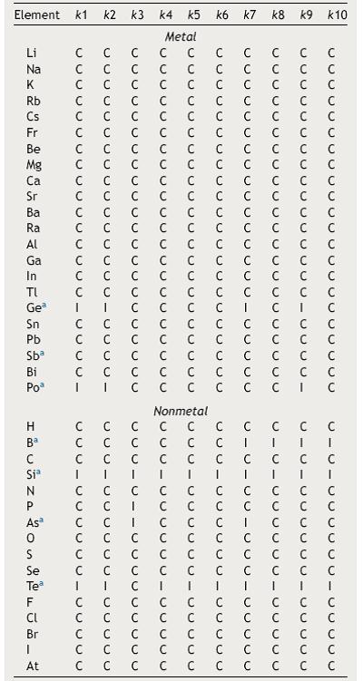 The majority of elements received a correct classification for all 10-nearest neighbors, which is indicated by the letter C. However seven elements received a wrong classification, indicated by the letter I. Five nonmetals were classified as metals whereas two metals were classified as nonmetals for at least one k value. Silicon was misclassified for all ten values of k , tellurium, nine; boron and germanium, four; polonium, three; arsenic, two; and phosphorus only one. These elements are metalloids, except phosphorus. Table 3 presents the number of elements wrongly classified for each k value and the rate of error.