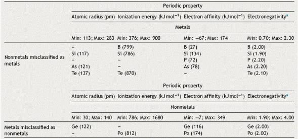 As stated before, the separation between elements typically metallic from those nonmetallic as traditionally drawn by a simple line in the periodic table is something relative to the property under consideration. When we consider the periodic properties the distinction is not so rigid. Actually a perfect classification would only be possible if the elements in both classes had distinct range for these properties, that is, there should be no overlap in multidimensional space, but this is not the case here.