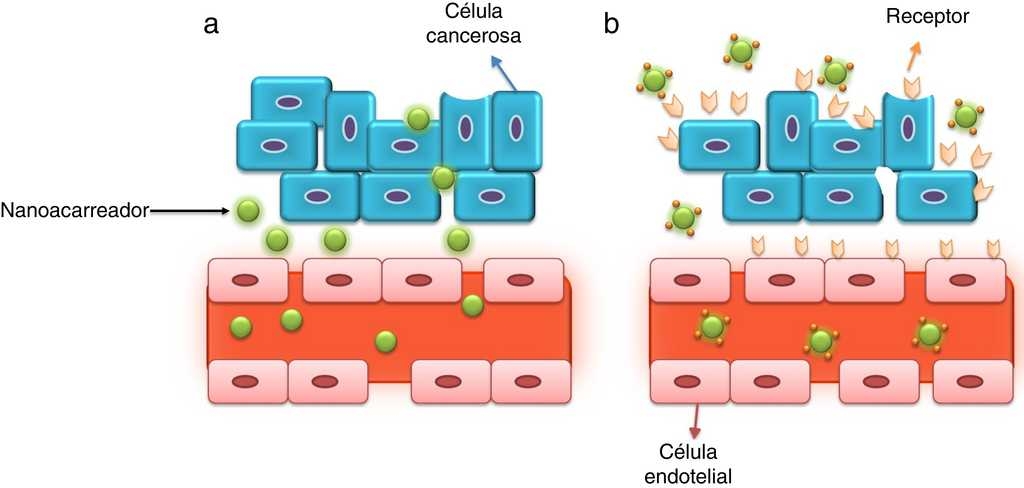 Acumulación activa. Las células tumorales suelen sobreexpresar algunos tipos de receptores de membrana que promueven su crecimiento descontrolado. Si el nanoacarreador se «decora» con un ligando (péptido, proteína o anticuerpo) que reconozca al receptor, se dirigirá y acumulará preferentemente en el tejido tumoral, en donde deberá liberar su carga terapéutica (fig. 3b) (Wicki, Witzigmann, Balasubramanian y Huwyler, 2015).