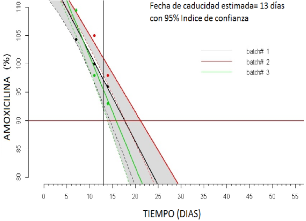 En el procesamiento de los datos experimentales, para establecer si los resultados de los 3 lotes son promediables, es necesario llevar a cabo un análisis de covarianza. Este análisis estadístico, está incluido en la programación de los software empleados en el tratamiento de los datos. La fecha de vencimiento se determina para cada uno de los lotes o para el promedio de ellos (si los tres lotes son promediables). La fecha de caducidad proyectada se determina por el punto de intersección de la curva inferior de ponderación de la recta de decaimiento de la potencia de amoxicilina, con el valor del límite inferior de potencia aceptable. Por lo cual siempre va a ser menor que el t90% obtenido mediante los estudios cinéticos, lo que aporta mayor seguridad en la proyección de la fecha de caducidad y tiene en cuenta la variabilidad de los procesos analíticos y de fabricación. Con el fin de simplificar la complejidad de este proceso matemático, habitualmente se emplean softwares con paquetes específicos para proceso de datos de estudios de estabilidad. Si los tres lotes no son promediables, se toma como fecha de vencimiento el peor caso, es decir, la menor fecha de caducidad obtenida en los 3 lotes analizados.