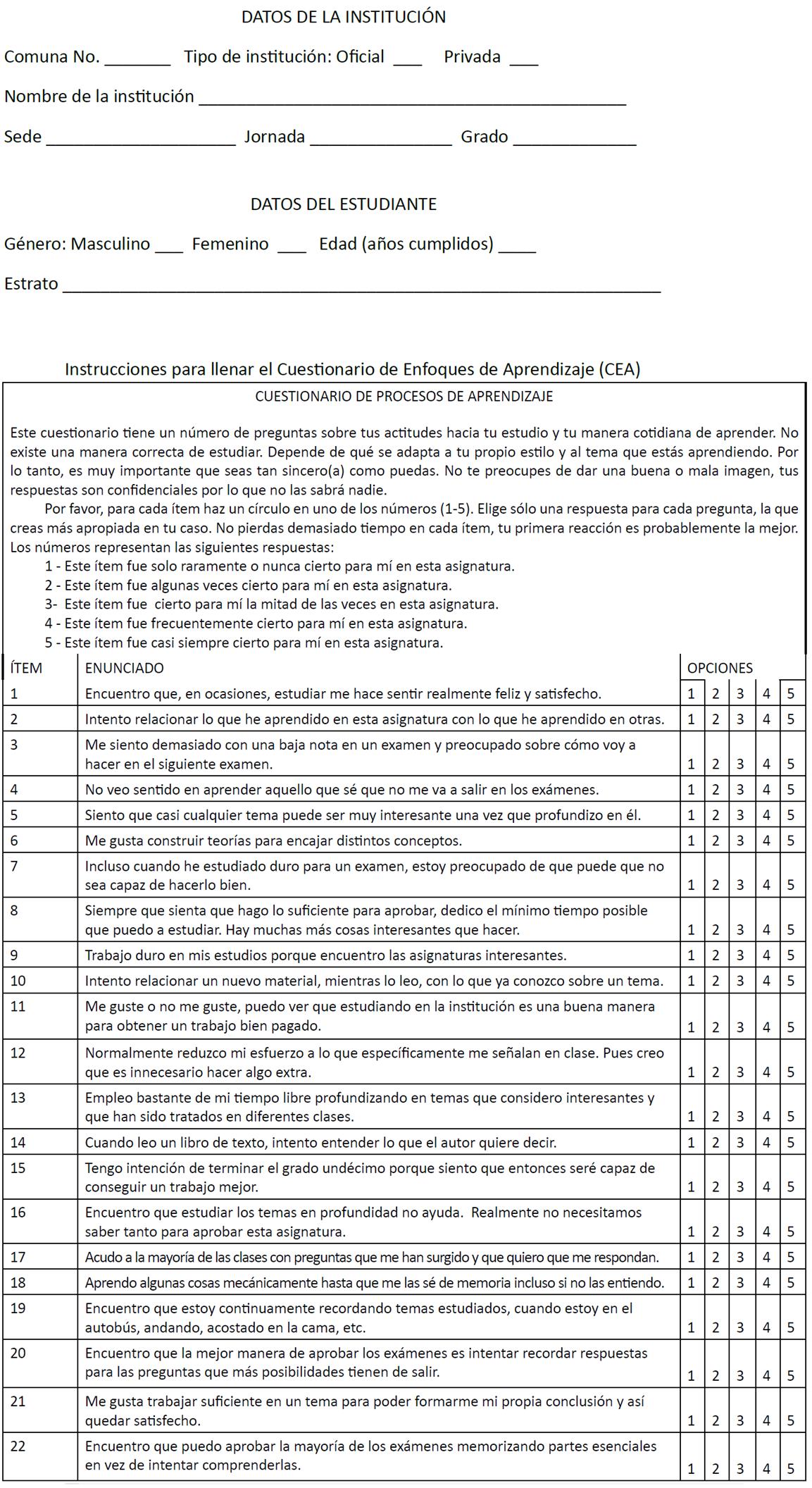 El CEA, traducido, adaptado y validado del original, el R-LPQ-2F (Kember, Biggs y Leung, 2004), para ser aplicado en el contexto Colombiano (Soler 2013), permite la caracterización del tipo de enfoque de aprendizaje de los estudiantes que conforman la muestra antes descrita.