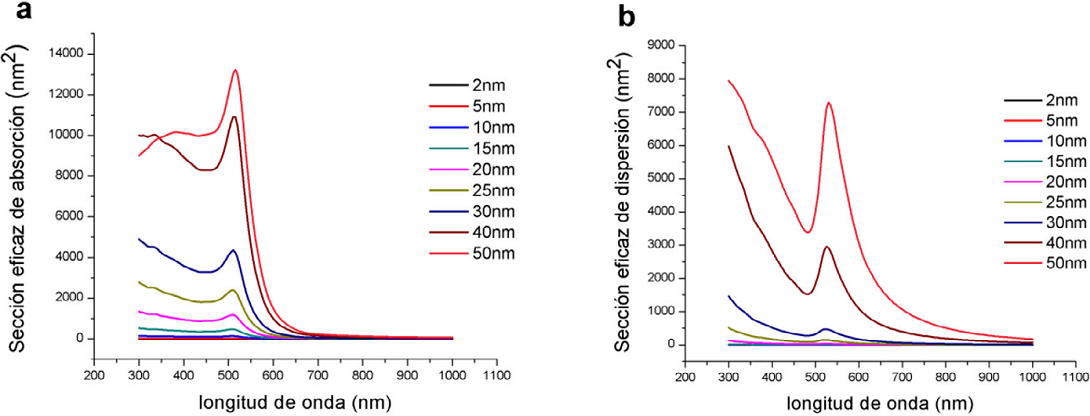 Figura 5 Simulación comparativa de los espectros de absorción (a) y dispersión (b) para nanopartículas de oro con diámetro variable entre 1 y 50 nm.