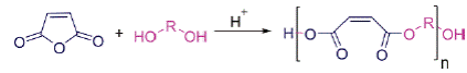 Las reacciones de polimerización en cadena vía radicales libres también son observadas en las resinas de poliéster insaturado. Estos adhesivos consisten en un poliéster que contiene grupos C=C en la cadena polimérica y un monómero. El poliéster se denomina insaturado porque contiene enlaces C=C dentro de la cadena principal y comúnmente se obtiene mediante la polimerización del anhídrido maleico con un glicol como se muestra en el Esquema 5 . (Issam, Hena, & Nurul Khizrien, 2012).