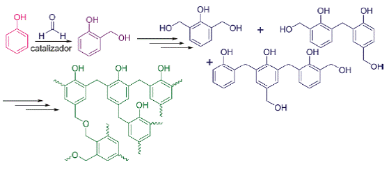 Las resinas fenólicas estas están constituidas por una mezcla de productos formados por la condensación del fenol y el formaldehído. Cuando la reacción se realiza en presencia de un exceso de formaldehído los productos de condensación son fenoles sustituidos con dos o más grupos -CH2OH. Estos grupos se denominan metiloles y pueden reaccionar mediante deshidratación con un carbono no sustituido de otro anillo aromático formando un enlace C-C. La deshidratación entre dos metiloles da como resultado la formación de un enlace C-O en el adhesivo (véase el Esquema 7). La formación de ambos tipos de enlaces (C-C y C-O) es responsable de las propiedades adhesivas de estas resinas (Grenier Loustalot, Larroque, Grenier, Leca, & Bedel, 1994).