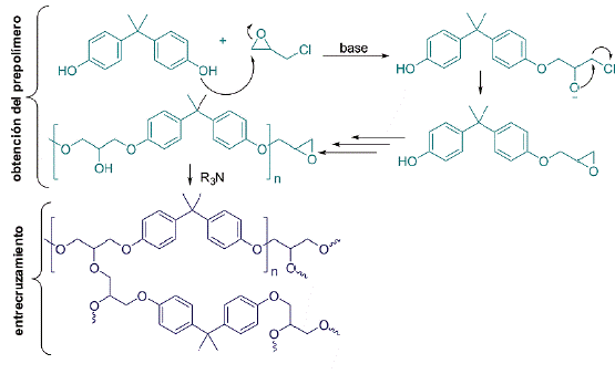 La formación de enlaces C-O también se observa en las resinas epóxicas. Las resinas epóxicas son adhesivos ampliamente difundidos en el mercado. Están constituidos por poliéteres que contienen grupos terminales epóxido (Gonçalez, Barcia, & Soares, 2006) . Estos son comercializados como un producto de dos componentes, uno de ellos llamado resina y el otro endurecedor. La resina, típicamente consiste en un polímero lineal obtenido de la polimerización del bisfenol A y la epiclorhidrina. La reacción de polimerización es realizada por apertura de epóxidos en presencia de un exceso de epiclorhidrina, a fin de obtener un polímero con grupos epóxido terminales y grupos pendientes hidroxilo. El endurecedor, este un catalizador básico que acelera la reacción de los grupos epóxido terminales con los grupos -OH pendientes de la cadena polimérica. La reacción de entrecruzamiento de la resina epóxica se ilustra en el Esquema 8. Esta reacción química forma nuevos enlaces covalentes C-O en el material produciendo la adhesión entre las superficies donde fue aplicado. (González Garcia, Sampaio, Neves, & Oliveira, 2008).