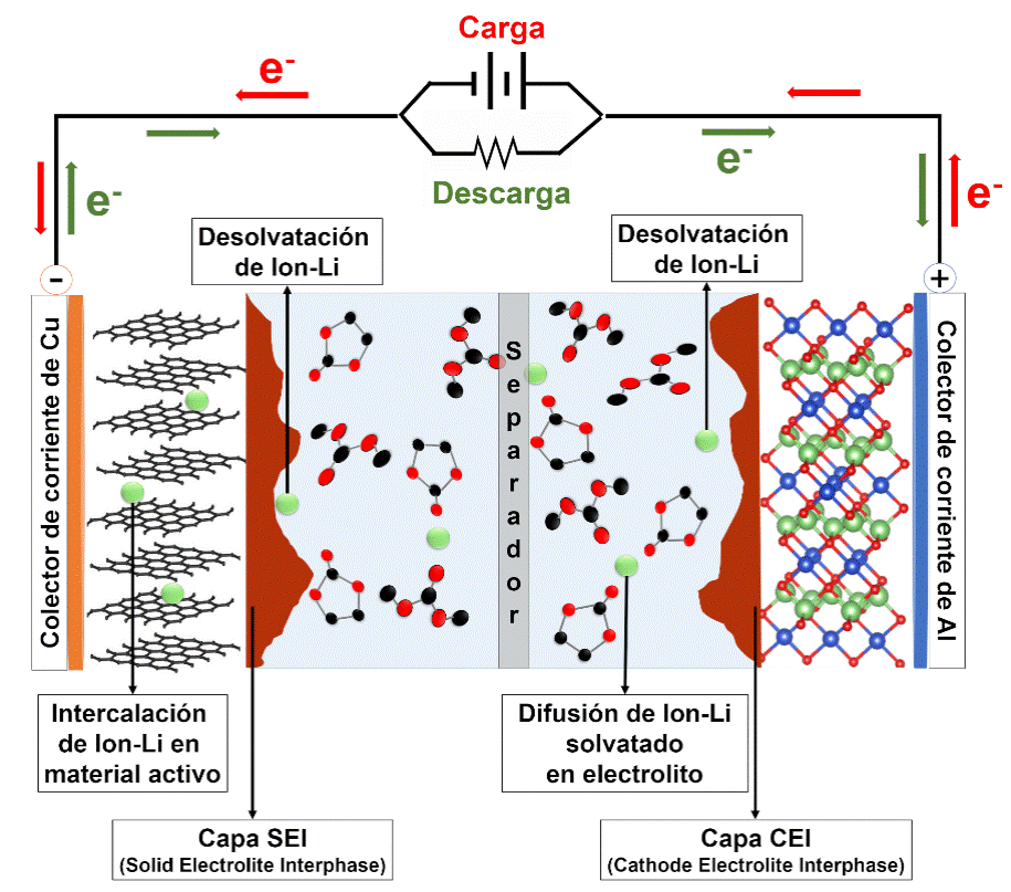 Debido a que el Ion-Li debe ser capaz de difundir en el electrolito y en el material activo, uno de los aspectos más relevantes a investigar y mejorar son los fenómenos que ocurren en la interfase electrodo/electrolito. Durante la inserción del Ion-Li en la estructura del material ocurre la desolvatación y, en la deserción, la solvatación del ion vuelve a ocurrir. Estos fenómenos involucran cambios energéticos que, junto con la transferencia de carga en los electrodos, inducen reacciones que promueven la formación de una capa de compuestos (como LiF y carbonatos insolubles de litio) sobre la superficie del electrodo. Esta capa va creciendo conforme el número de ciclos aumenta, formando otras especies químicas insolubles tales como Li2O o LiO-R. De la composición, propiedades y estabilidad de esta capa dependen aspectos críticos para el desempeño de la celda, como su eficiencia, ciclabilidad y seguridad. El conocimiento que se tiene actualmente sobre la formación de esta capa es insuficiente, y su grado de avance es mayor del lado del electrodo de bajo potencial (usualmente denominado como SEI, “solid electrolyte interfase”) que del de alto potencial. Lo que sí se sabe es que el objetivo perseguido es lograr que estas capas permitan la difusión de los iones de litio al mismo tiempo que impidan el transporte de electrones (aislante eléctrico) (Gauthier, 2015).