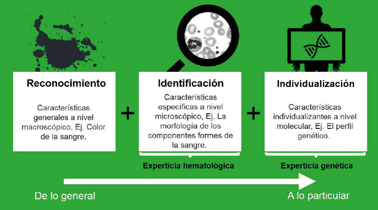 La criminalística se ha definido como una disciplina científica dirigida al reconocimiento, identificación e individualización de las evidencias físicas (Guzmán, 2000). Si apelamos a un ejemplo, como criminalista reconozco a nivel macroscópico la mancha porque su color es similar a la sangre, la colecto y se identifica para confirmar que sea sangre, por último la evidencia se envía al laboratorio de genética forense para individualizarla al compararla con una muestra de identidad conocida, es decir para establecer ¿A quién pertenece? (Figura. 1). Durante ese recorrido, se hace uso de la química forense a través de las pruebas de orientación y de certeza. Dentro de estas pruebas de orientación, se encuentran las pruebas colorimétricas.