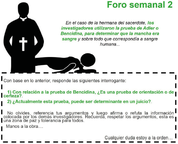 De acuerdo con Mendoza (2015), la importancia de analizar los contenidos y su discurso se enmarca dentro de la interpretación y compresión del sentido de lo que se plasma en la comunicación, con el objeto de ofrecer un marco común. Es decir, a través del foro propuesto se construyó un marco referencial sobre las sustancias que pueden arrojar un resultado similar con la prueba de bencidina; así como, el criterio para realizar esta prueba, resaltándose la intuición que debe poseer un criminalista ante un indicio que pudiera ser vinculante con el hecho o frente a la duda que pude generar una sustancia que se asemeje con las características macroscópicas de la sangre. En tal sentido, el 100% de los estudiantes plasmaron en el foro la interpretación de los resultados de la prueba de bencidina.