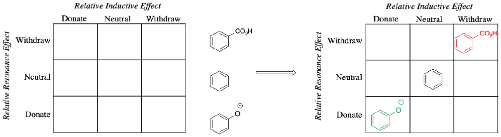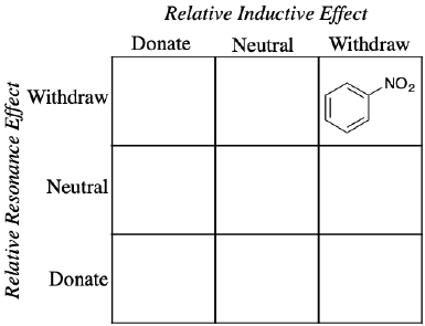 Interestingly, the 'chemical space' wherein a substituent withdraws by induction and donates by resonance (i.e. the lower right-hand quadrant of the grid) completely overwhelms the known possibilities in which donation according to induction and withdrawal according to resonance occur (i.e. the upper left-hand quadrant of the grid). We could only find one example of the latter substituent type. Highlighting these rarities might prove useful to motivate students to investigate reactivity on their own to fill the grid completely (Figure 19). Activated substituents (approximately centered in the lower left-hand quadrant of grid) and deactivated substituents (approximately centered in the upper right-hand quadrant of grid) are clearly separated.