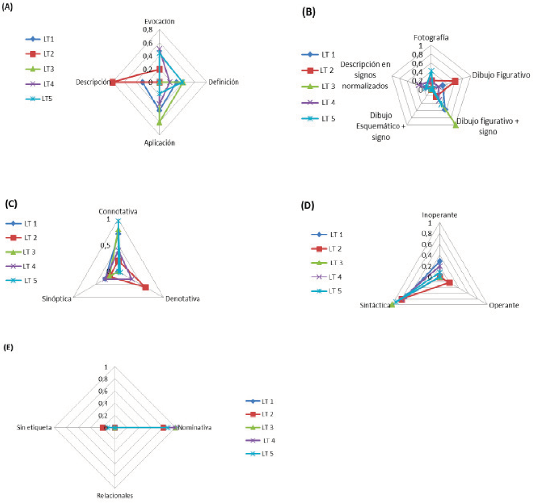 En relación a los resultados obtenidos en el análisis de los libros de texto (LT) de 1° año de Enseñanza Media en las distintas categorías, los resultados se resumen en la figura 2 (A-E).