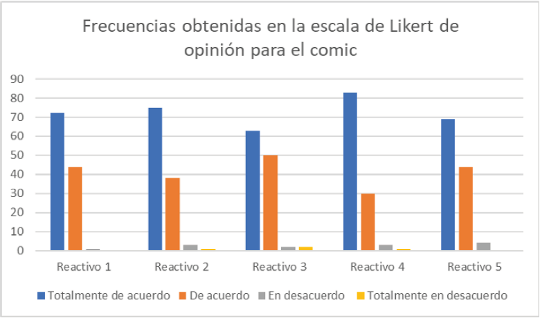 Con respecto a la percepción de opinión de los alumnos acerca del material didáctico, considerando los siguientes ítems: (1) el uso de este material me motivó a conocer más acerca de la espectroscopia IR, (2) el lenguaje utilizado en el cómic me fue de fácil comprensión, (3) este material me ayudó a comprender el fundamento de la técnica, (4) este material es de ayuda para saber qué es un espectro en el infrarrojo y (5) la presentación del tema de espectroscopia IR empleando cómics me ayudó a entender mejor la técnica del IR; al agruparlos por frecuencias se obtuvo la Gráfica 2, la cual mostró que las apreciaciones de los alumnos fueron favorables, al encontrarse principalmente dentro de las categorías "Totalmente de acuerdo " y "De acuerdo".