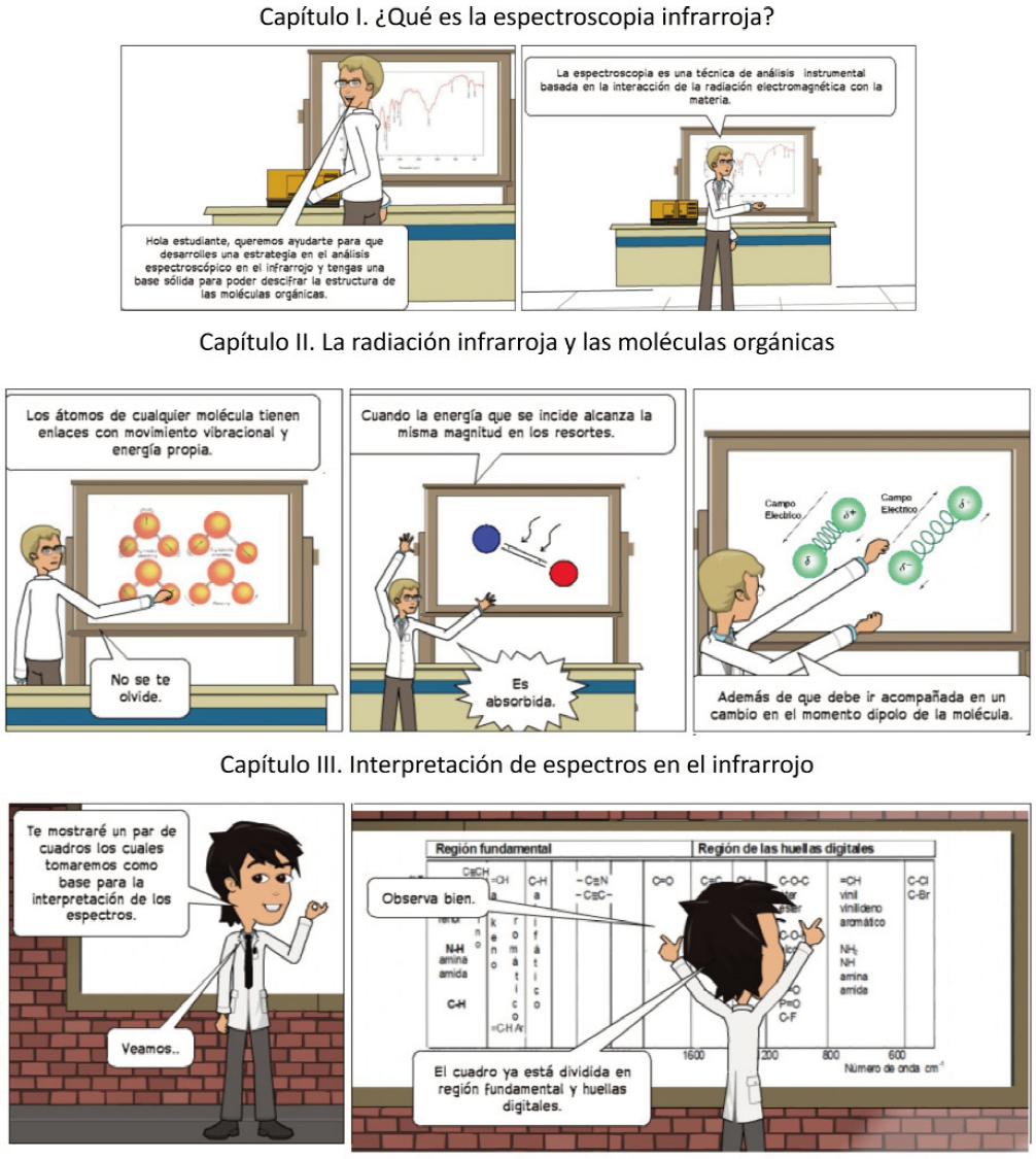 Para el diseño de los cómics se abordó el contenido de manera lúdica, en forma de diálogo, con un lenguaje sencillo, agradable y divertido, dirigido a profesores y principalmente estudiantes; considerando que estos últimos hayan cursado previamente el nivel básico de química orgánica de acuerdo al Plan de Estudios de las carreras a las que va dirigido este material: Biología, Ingeniería Química y QFB. En el material presentado se buscó plantear de una forma más amigable la información, para captar la atención de los alumnos y de los docentes; además, se incluyó de forma concreta el fundamento teórico sobre la espectroscopia en el IR, la interacción de la radiación infrarroja con la materia y los principios básicos para la interpretación de espectros, que permitan iniciar con la interpretación de un espectro en el IR. Algunas de las imágenes de los cómics generados, se muestran en la Figura 1.