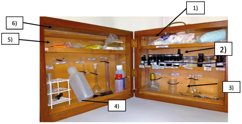 Se utilizó un laboratorio portátil diseñado y provisto con materiales de un laboratorio básico para la enseñanza de la química con base en los temas de la Programación Curricular Anual del MINEDU. Sus características se observan en la Figura 1. Consta de seis espacios separados: