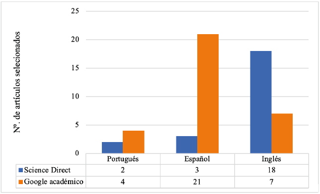 De acuerdo con la Tabla 2, se seleccionaron cincuenta y cinco (55) artículos entre los diferentes idiomas, palabras claves y bases de datos. En el Gráfico 1 se muestra el número de artículos seleccionados por idioma y por base de datos.