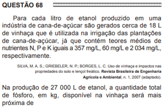 Pelo panorama da questão supracitada é nítida a presença da Matemática na sua resolução, pois há a necessidade de fazer relações da quantidade fornecida de etanol com o que é produzido (por L de etanol). A transformação de unidade também remete aos conceitos de Matemática na resolução do problema, sendo importante compreender os processos de proporção, multiplicação e divisão, ou seja, duas das quatro operações básicas da Matemática.