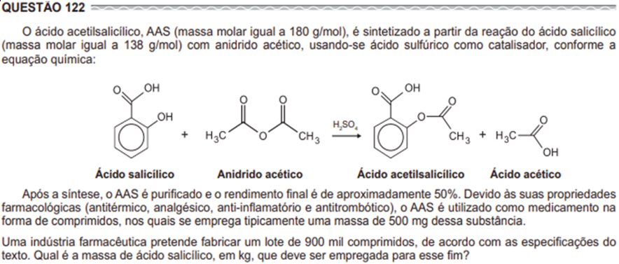 Na Figura 3 observa-se a questão 122 do Enem de 2017. No contexto da pergunta é feito uma abordagem sobre quantas gramas do Ácido Salicílico são necessários para produzir 900 mil comprimidos de Ácido Acetilsalicílico de acordo com a reação ilustrada.