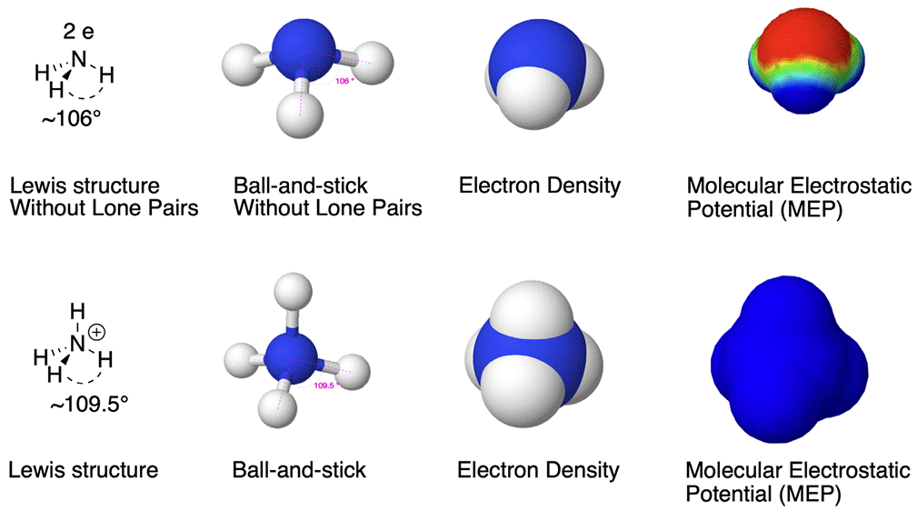 Because there is little or no chance at reconciliation among the proponents of each model, we suggest a sixth option that avoids all inconsistencies for molecules with non- bonding electrons (e.g. containing elements in groups 15, 16 or 17 in the periodic table): do not place a lone pair in a specific shape or geometry of the Lewis (2D) or the ball-and-stick (3D) structure (Figure 2). There are four ‘non-bonding’ electrons around oxygen in water they do not have to be placed in two lone pairs; rather use them as a placeholder. There is no need to draw lone pair shapes, nor is it necessary to emphasize the lone pairs in a three- dimensional structure - experimental structures show only the position of the nuclei and the electronic density of any molecule. Reasonable molecular dimensions can be estimated with 95 % of the total electronic-density function p(r) that is included in a surface at contour 0.002 electrons/bohr3 (Sjoberg & Politzer, 1990). The nuclear positions and electronic density can be illustrated in the common ball-and-stick and space-filling models, respectively, which are adequate for the teaching of introductory students. Subsequently, if necessary, a surface of molecular electrostatic potential (MEP) mapped onto the electronic density and color-coded to indicate attraction (red) or repulsion (blue) to a positive charge provides a three-dimensional structure and its relation to reactivity, properties and spectra (Shusterman & Shusterman, 1997). When the hydronium ion is analyzed relative to water (Figure 2), there are differences in the bond angles, the surface of electronic density and the electrostatic potential. The latter shows that the positive charge is localized on the hydrogens, as opposed to the formal positive charge on oxygen.