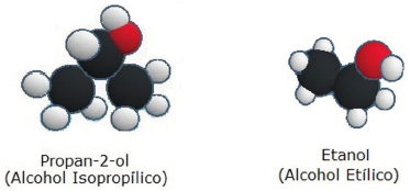 Se usó agua destilada, etanol al 96% de pureza y propan-2-ol al 100% de pureza. Sus estructuras moleculares se muestran en la Figura 2. Las esferas de color negro representan los carbonos, las esferas de color negro a los hidrógenos y finalmente las esferas de color rojo a los oxígenos presentes en la molécula.