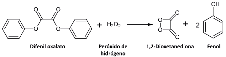 Usualmente, el líquido del compartimiento exterior consta de una solución de peróxido de hidrógeno. El líquido del compartimiento interior consta de una mezcla de difenil oxalato, salicilato de sodio (catalizador), uno o varios cromógenos y un solvente orgánico. Al doblarse la barra de luz, el compartimiento interno se rompe y el peróxido de hidrógeno queda en contacto con los componentes de la solución del compartimiento interior, dando lugar a la reacción mostrada en la Figura 10.