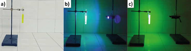 Los resultados obtenidos para la demostración de la fluorescencia de la fluoresceína se muestran en la Figura 3.a. Como se puede observar, la fluoresceína, al estar en contacto con la luz blanca del medio ambiente o expuesta a las lámparas de iluminación convencional, presenta un color verde similar al observado en el fenómeno de fluorescencia. Esto es debido a que la luz blanca está compuesta por todas las longitudes de onda del espectro electromagnético, por tal motivo, parte de esa radiación corresponde al color azul, y por lo tanto puede generar el fenómeno de fluorescencia en la muestra.