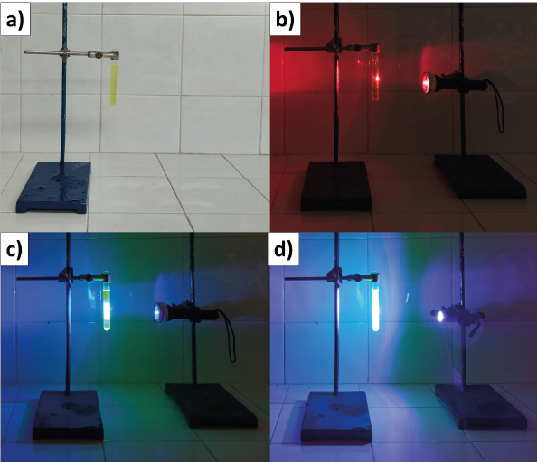 Figura 3 Resultados obtenidos en los experimentos realizados para la demostración del fenómeno de fluorescencia de la fluoresceína empleando a) luz blanca, b) luz roja, c) luz azul y d) luz UV.