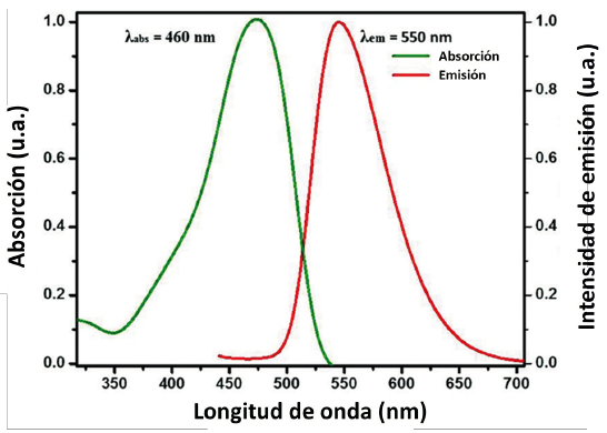 De acuerdo al espectro de absorción/emisión de la fluoresceína mostrado en la Figura 2, se puede discernir que este compuesto puede absorber radiación a longitudes de ondas correspondientes las regiones ultravioleta - azul y emitir radiación en la región del color verde (Kristoffersen et al., 2018).