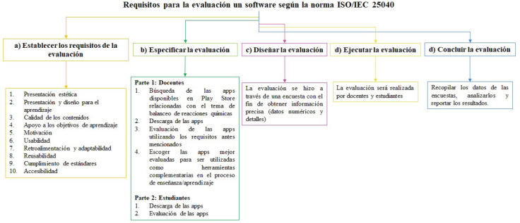 Para llevar a cabo la evaluación de las aplicaciones móviles relacionadas con el tema de balanceo de reacciones químicas, se realizó una búsqueda en Play Store y se seleccionaron 15 aplicaciones. Se evaluaron teniendo en cuenta aspectos enmarcados en la norma ISO/ IEC 25040 (ISO, 2021) y en Cháves et al. (2021), según se describe en la Figura 1. Con el objetivo y los pasos de la evaluación definidos por Nesbit et al. (2002) y Otamendi et al. (2018), se diseñó una encuesta de evaluación para estudiantes y docentes (ver Figura 2). Los docentes evaluaron las aplicaciones en primer lugar, seguidos por los estudiantes.