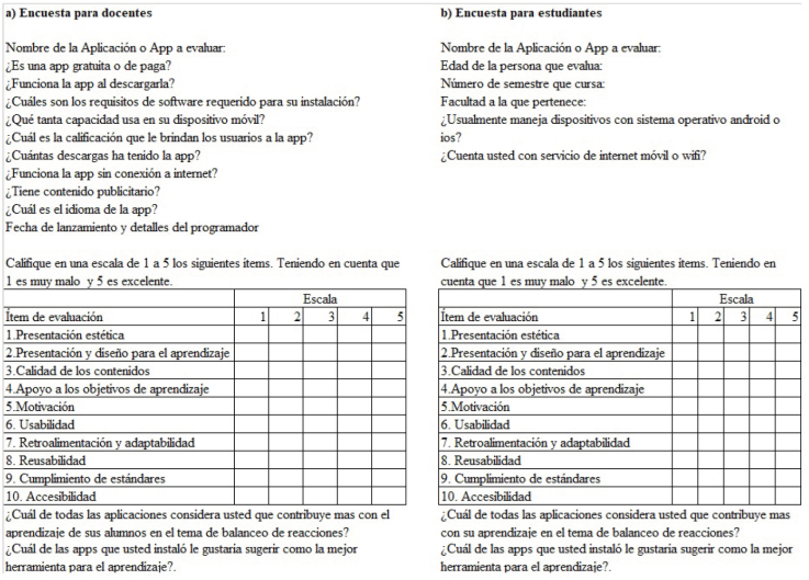 Figura 2 Encuesta para a) docentes y b) estudiantes.